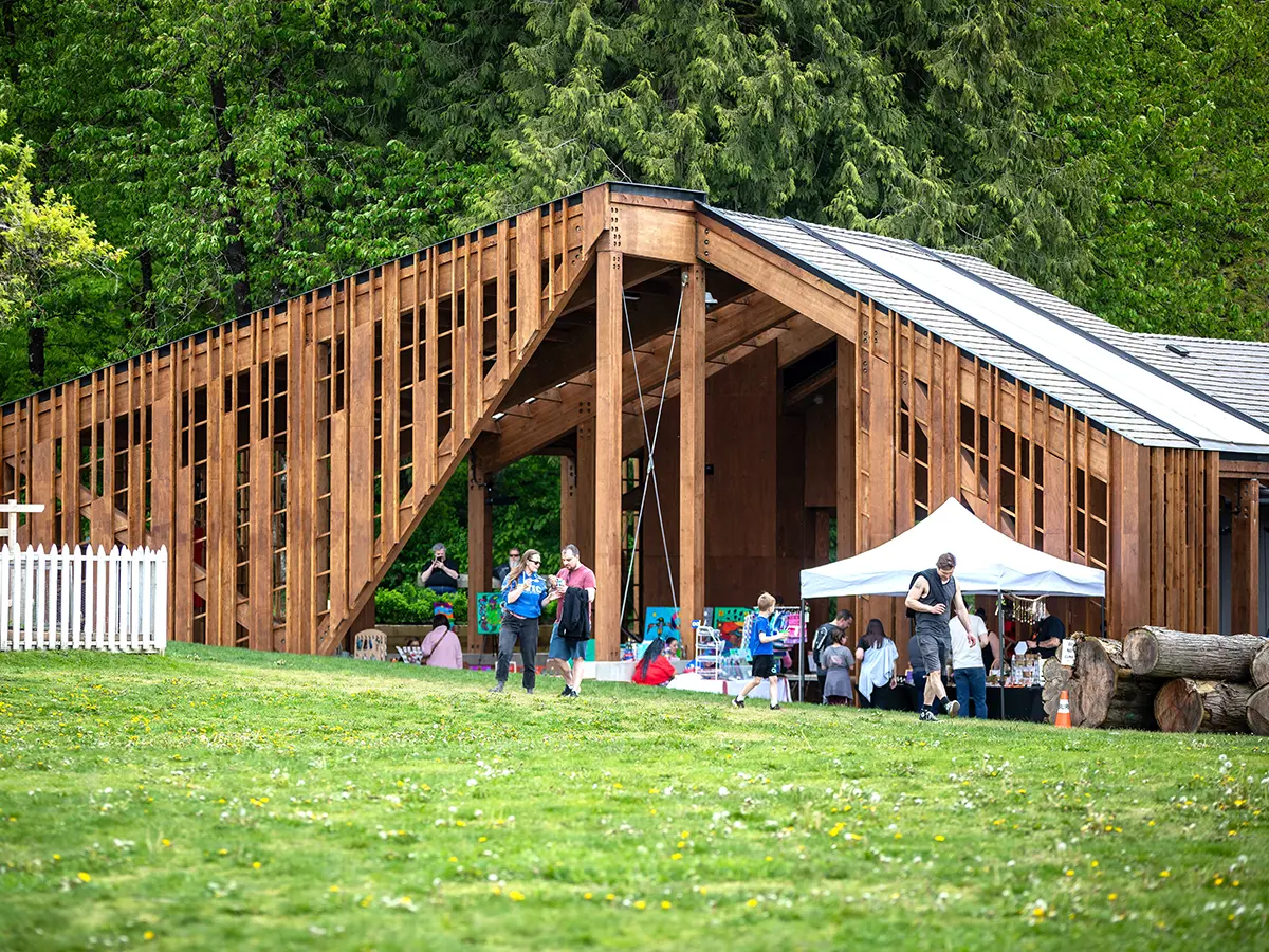 Totest Aleng: Indigenous Learning House, located in Surrey’s Elgin Heritage Park, provides a place for learning, healing, and cross-cultural connection. It offers a welcoming space for community building where Indigenous artists and knowledge keepers can share their practices, while also inviting the wider public to learn about Indigenous histories, rights, and ways of knowing. Created through an extensive consultation process with Semiahmoo, Kwantlen, and Katzie First Nations, every element of its design — from the wood-forward architecture inspired by Coast Salish longhouses to its flexible programming spaces — responds directly to what was heard through dialogue with Indigenous community members and cultural practitioners.