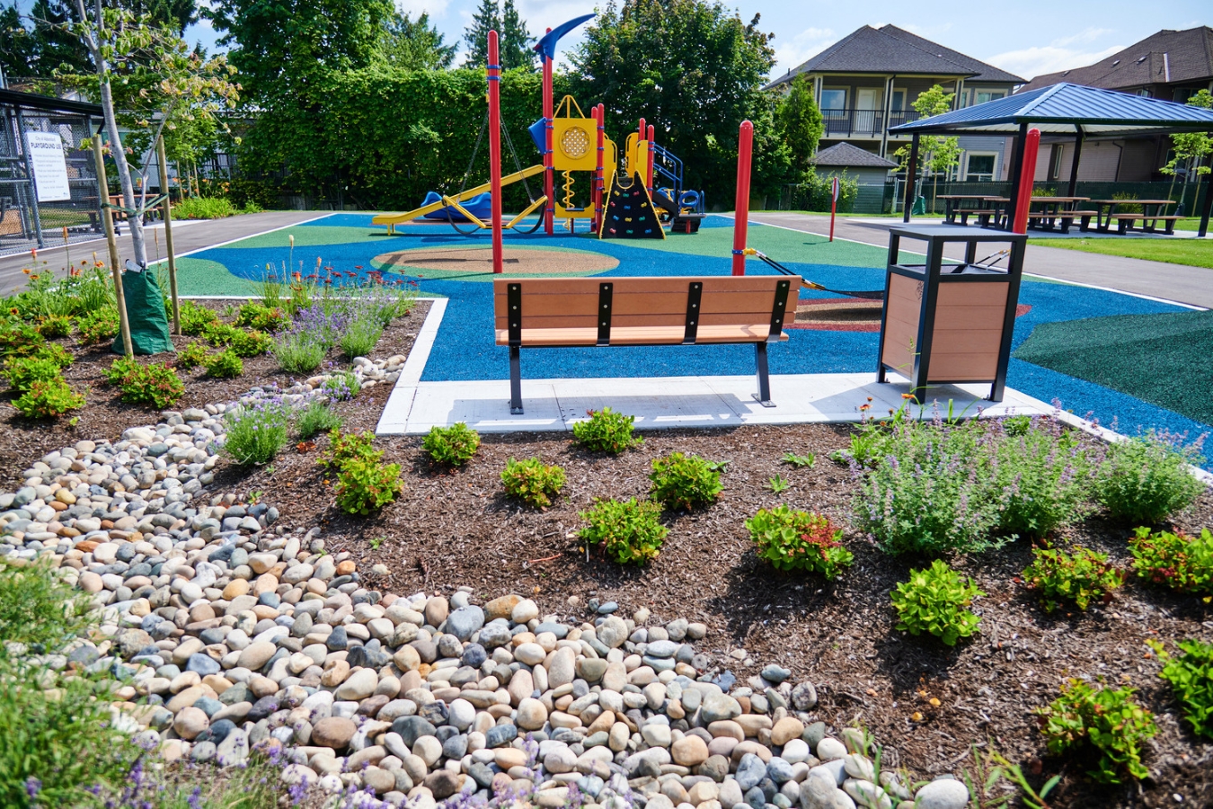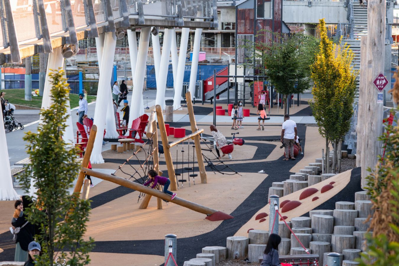 The City of New Westminster’s Sixth Street Play Area promotes community health, social connection, and climate resilience. This accessible urban park offers diverse play opportunities supporting children’s cognitive, physical, and emotional development, while featuring native trees, recycled materials, and permeable surfaces to enhance environmental sustainability and urban canopy cover.
