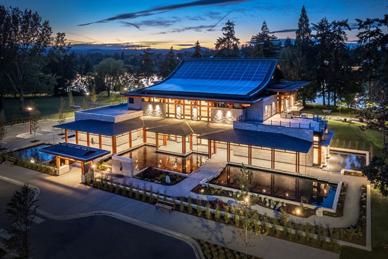 Gorge Pavilion Park exemplifies sustainable design, community connection, and cultural reflection. Located in Gorge Park, the facility commemorates the area’s historic Japanese teahouse while offering inclusive indoor and outdoor spaces that promote wellness, social gathering, and environmental stewardship. With its locally sourced materials, energy-efficient features including 126 solar panels, and a strong commitment to accessibility, the Pavilion stands as a model for innovation and community-centered design in BC.